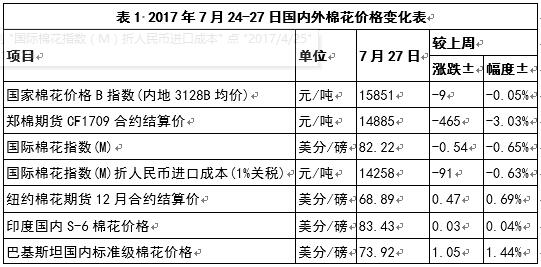 本周,國內(nèi)外棉花現(xiàn)貨價格略跌,巴基斯坦棉價上漲;ICE期棉維持盤整,鄭棉期貨大幅下跌(表1)。