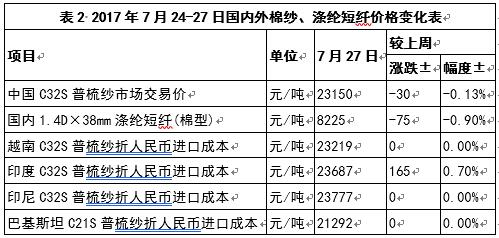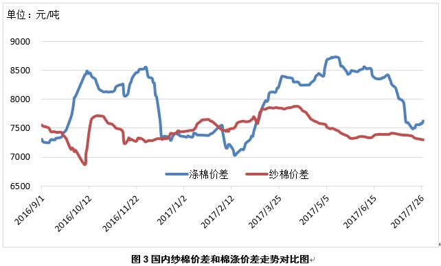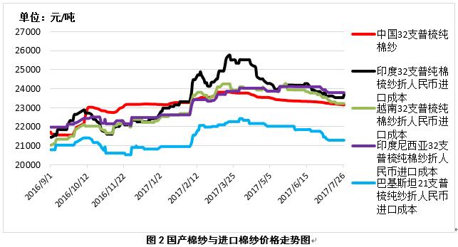 2、內(nèi)外棉紗價差擴大。7月27日,越南32支普梳純棉紗23219元/噸(折人民幣進口成本,下同),較中國國內(nèi)32支普梳純棉紗高69元/噸,價差較上周擴大30元/噸;印度32支普梳純棉紗23687元/噸,較中國國內(nèi)32支普梳純棉紗高537元/噸,價差較上周擴大195元/噸;印尼32支普梳純棉紗23777元/噸,較中國國內(nèi)32支普梳純棉紗高627元/噸,價差較上周擴大30元/噸(圖2)。