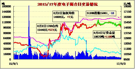 8月2日電子撮合交易成交量增加,合同均價多數(shù)收漲,活躍交投主要集中于中遠(yuǎn)期合同,MA1712成交量最大,為3450噸;訂貨量增加,其中MA1801增加最多,為460噸;合同均價全多數(shù)收漲。