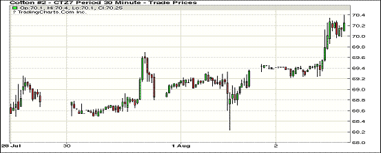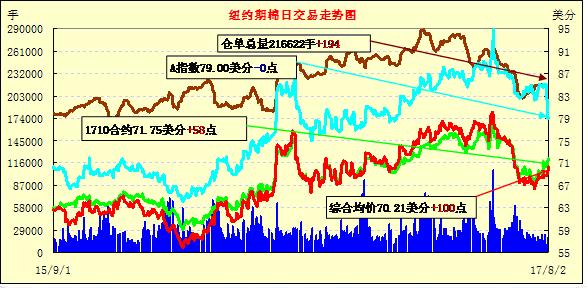 周三紐約期棉連續(xù)第三個交易日收漲,12月合約累計上漲154點;1712合約收于70.34美分/磅,漲103點;1803合約收于69.62美分/磅,漲93點。當(dāng)日紐約期棉開盤后主力合約窄幅震蕩,之后買盤增加,合約價沖高,最高價70.40美分/磅,最終收于當(dāng)日走勢區(qū)間高位。周三美元指數(shù)下跌,市場關(guān)注周四發(fā)布的美棉出口報告,至本周四為美棉出口的第52周,2016/17年度的最后一周,至51周時,2016/17年度美棉裝運已達到304萬噸。