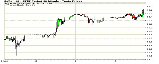 4日紐約期棉市場多數(shù)合約小幅上漲,1712合約收于70.62美分/磅,漲46點(diǎn);1803合約收于美分70.05/磅,漲34點(diǎn)。12/3月合約價(jià)差57點(diǎn)。12月合約整日交易圍繞在70.4美分一線窄幅波動,交易最后時(shí)段打破區(qū)間,小幅收漲。分析師指出,基本面美國德州出現(xiàn)普遍降雨,對棉花增產(chǎn)提供有利條件,但技術(shù)面來看12月合約經(jīng)過橫盤整理打破69美分阻力位,下一步壓力位在71美分。