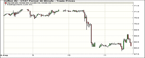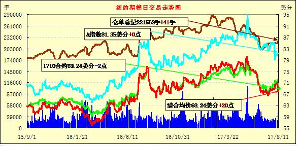 11日紐約期棉市場(chǎng)在經(jīng)歷前一日大跌后修整,1712合約收768.25美分/磅,漲14點(diǎn);1803合約收于68.05美分/磅,漲22點(diǎn)。12/3月合約價(jià)差20點(diǎn)。當(dāng)日12月合約上半場(chǎng)交易在68-68.5美分之間窄幅波動(dòng),盤中跌破68美分,最低至67.76美分。但市場(chǎng)短暫低位盤整后獲得支撐,從低點(diǎn)反彈回歸68美分以上,終以小漲收盤。分析師指出,市場(chǎng)從70美分以上回落到68美分一線,帶動(dòng)現(xiàn)貨市場(chǎng)詢盤和成交增加。
