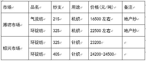 紹興地區(qū):價(jià)格波動(dòng)不大,相對(duì)其它市場較穩(wěn)定,產(chǎn)品質(zhì)量要求較高,C32S針織價(jià)格23200元/噸,C40S針織價(jià)格24200-24500元/噸,基本沒什么變化,噴氣類C32S、40S市場貨源較少,價(jià)格略挺。