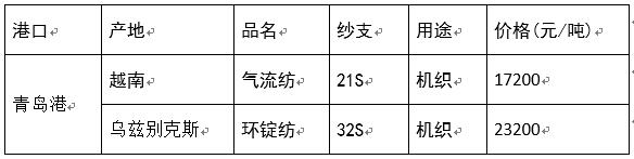 青島港32S印度、烏茲別克斯坦紗貨源穩(wěn)定,價(jià)格高,出貨慢,越南紗相對(duì)缺貨。氣流紡21S越南和臺(tái)灣紗較多,貨源緊張,印度紗基本沒有資源。