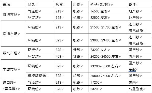 南通地區(qū):噴氣品質(zhì)21S、32S以進(jìn)口紗為主。C21S價(jià)格21500-21700元/噸左右、C32S價(jià)格23000-23400元/噸左右,以上價(jià)格必須達(dá)到噴氣品質(zhì),價(jià)格沒變動(dòng)。