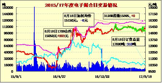 8月18日電子撮合交易成交量減少,合同均價多數(shù)收漲,MA1709成交量最大,為340噸;訂貨量減少,其中MA1712減少最多,為380噸;合同均價多數(shù)收漲。