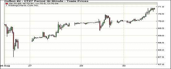 周三紐約期棉繼續(xù)上漲,主力合約沖上70美分;1712合約收于70.85美分/磅,漲87點;1803合約收于69.98美分/磅,漲60點。當(dāng)日主力合約沖高,回落后依然保持在110點波動范圍頂部,主力合約在連續(xù)三個交易日上漲270點。目前颶風(fēng)“哈維”在德克薩斯造成的損失還無法統(tǒng)計,但周三“哈維”再次登陸路易斯安那海岸,但已減弱為熱帶風(fēng)暴,預(yù)計給三角洲棉區(qū)帶來大量降水。