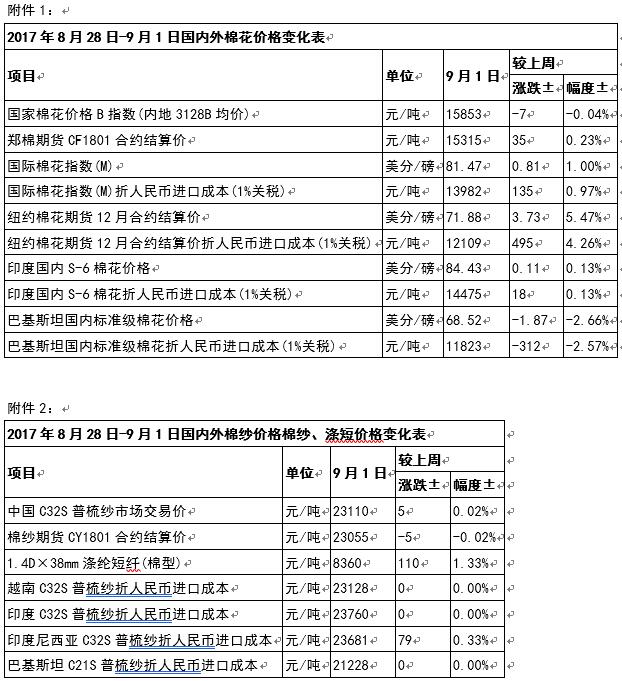 附件1:2017年8月28日-9月1日國(guó)內(nèi)外棉花價(jià)格變化表
