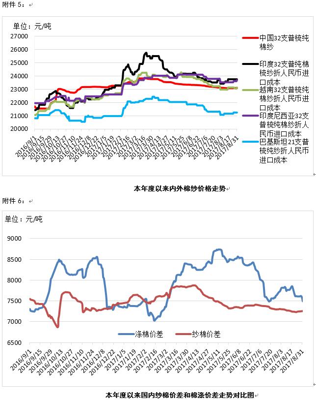本周?chē)?guó)內(nèi)棉紗部分品種需求好轉(zhuǎn),棉紗價(jià)格小幅上漲;外紗成交尚可,局部?jī)r(jià)格繼續(xù)上漲。9月1日國(guó)內(nèi)32支純棉普梳紗報(bào)價(jià)23110元/噸,較上周上漲5元,漲幅0.02%;越南C32S普梳紗折人民幣進(jìn)口成本23128元/噸,印度C32S普梳紗折人民幣進(jìn)口成本23760元/噸,巴基斯坦C21S普梳紗折人民幣進(jìn)口成本21228元/噸,均較上周持平;印尼C32S普梳紗折人民幣進(jìn)口成本23681元/噸,較上周上漲79元/噸,漲幅0.33%。內(nèi)外棉紗加權(quán)平均價(jià)差172元/噸,較上周基本持平。另外受環(huán)保整治力度增加影響,國(guó)內(nèi)棉布、滌綸短纖價(jià)格上漲,代表國(guó)內(nèi)棉布主流品種C32支純棉斜紋布報(bào)價(jià)5.713元/米,較上周上漲0.009元/米,漲幅0.16%;滌綸短纖報(bào)價(jià)8360元/噸,較上周上漲110元/噸,漲幅1.33%。