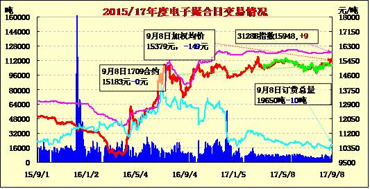 9月8日電子撮合交易成交量減少,合同均價多數(shù)收跌,成交積極合約主要集中于中遠期合同,MA1711成交量最大,為1160噸;訂貨量減少,其中MA1711增加最多,為360噸;合同均價多數(shù)收跌。