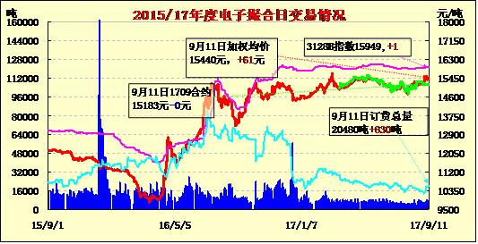 9月11日電子撮合交易成交量增加,合同均價漲跌互現(xiàn),成交積極合約主要集中于中遠期合同,MA1801成交量最大,為2600噸;訂貨量增加,其中MA1712增加最多,為410噸;合同均價漲跌互現(xiàn)。開秤時間,各地根據棉花生長情況有所不同,新州、蔡甸、仙桃等地企業(yè)開秤較早,荊州、黃岡等地企業(yè)開秤相對晚些。和往年一樣,早期入市收購的仍以200型企業(yè)為主,黃岡某企業(yè)負責人介紹,當地400型企業(yè)幾乎沒開秤,200型企業(yè)3.2元/斤收購,及時加工,銷售價14200元/噸左右,賺取一定利潤加快周轉。相比去年,今年400型企業(yè)參與新棉收購數量將有所增加。某400型企業(yè)已連續(xù)2年沒在本地收購,今年剛開秤收購,開秤第一天就收購了3萬多斤籽棉,該廠負責人感慨如再不運行,機器設備將閑置報廢,連加工技術人員都難招了。