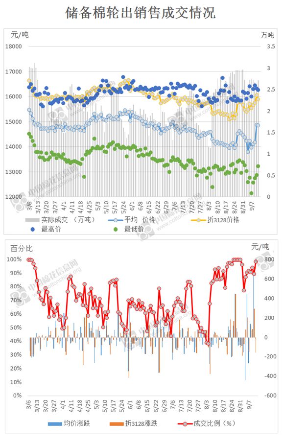 9月13日儲(chǔ)備棉輪出銷售資源27446.4829噸,實(shí)際成交27081.4629噸,成交率98.67%。成交平均價(jià)格14858元/噸(較前一日價(jià)格跌9元/噸);折3128價(jià)格15898元/噸(較前一日價(jià)格跌156元/噸)。