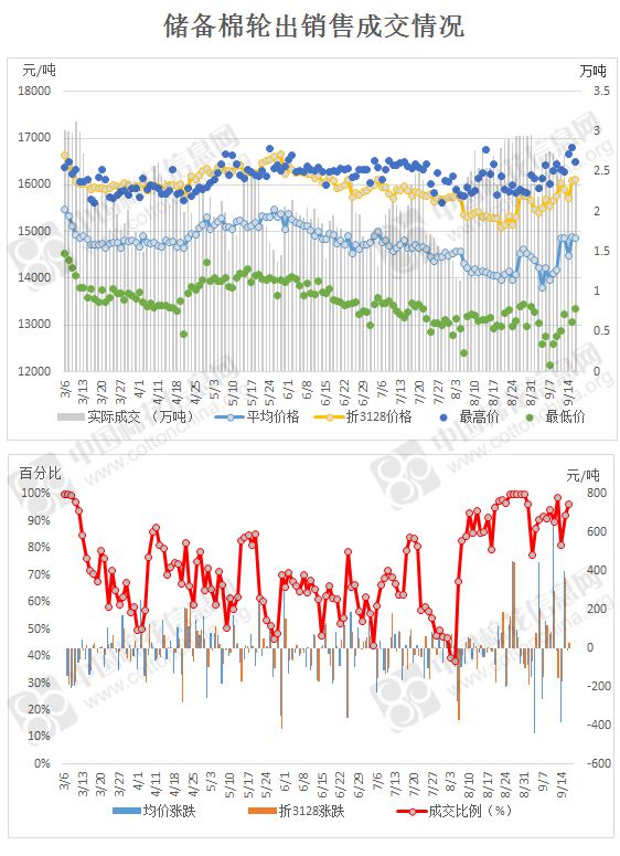 9月18日儲(chǔ)備棉輪出銷售資源25150.8017噸,實(shí)際成交24219.2424噸,成交率96.30%。成交平均價(jià)格14861元/噸(較前一日價(jià)格跌14元/噸);折3128價(jià)格16115元/噸(較前一日價(jià)格漲26元/噸)。