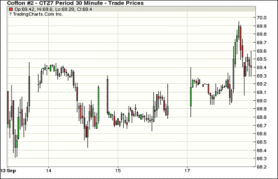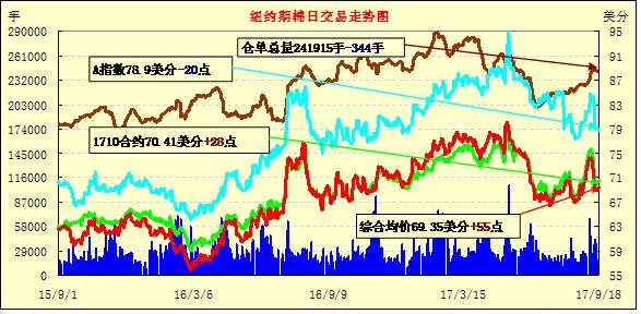 在連續(xù)多日下跌后,周一紐約期棉上漲;1712合約收于69.50美分/磅,漲43點;1803合約收于68.90美分/磅,漲91點。當日主力合約早盤小幅下挫后微幅震蕩,盤中買盤活躍上漲,收盤前合約從高位下跌,但依然處于當日交投區(qū)間上半部。近日現(xiàn)貨詢盤有限,貿易商保持謹慎,目前12/3月價差在60點。市場關注官方預測的颶風Irma和哈維造成的損失,另外5級颶風瑪利亞已經生成并且北上。