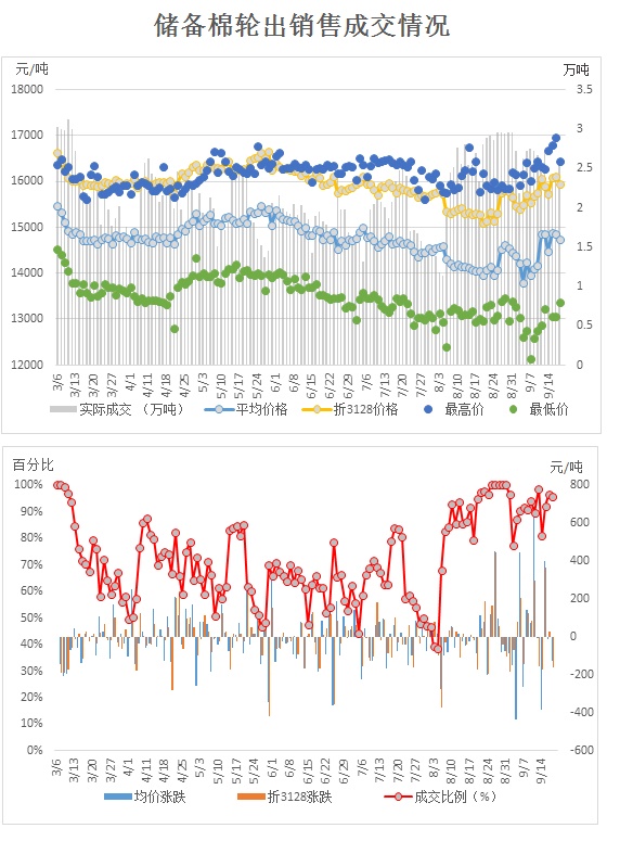 9月19日儲備棉輪出銷售資源27113.4023噸,實際成交25979.1575噸,成交率95.82%。成交平均價格14735元/噸(較前一日價格跌126元/噸);折3128價格15952元/噸(較前一日價格跌163元/噸)。