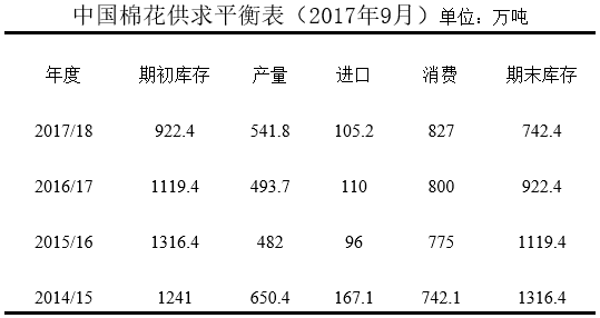 2016/17棉花年度,全球經(jīng)濟(jì)溫和復(fù)蘇,我國(guó)經(jīng)濟(jì)運(yùn)行保持在合理區(qū)間,穩(wěn)中向好態(tài)勢(shì)趨于明顯。全球棉花消費(fèi)趨于改善,以及儲(chǔ)備棉輪出順利,數(shù)量逐步消化、棉花目標(biāo)價(jià)格政策明確等因素影響,棉花行業(yè)形勢(shì)有所回暖,紡織行業(yè)主要指標(biāo)呈恢復(fù)態(tài)勢(shì),棉花生產(chǎn)和消費(fèi)出現(xiàn)回升,市場(chǎng)價(jià)格穩(wěn)中有升。據(jù)中國(guó)棉花協(xié)會(huì)統(tǒng)計(jì),2016年度全國(guó)棉花產(chǎn)量493.7萬(wàn)噸,進(jìn)口量110萬(wàn)噸,消費(fèi)量800萬(wàn)噸,儲(chǔ)備棉輪出266萬(wàn)噸,全年產(chǎn)需基本平衡;截止8月底,全國(guó)大部棉區(qū)氣象條件總體適宜棉花生長(zhǎng),棉花發(fā)育期偏早,新棉開(kāi)始零星采摘,預(yù)計(jì)2017/18年度全國(guó)棉花總產(chǎn)量為546.7萬(wàn)噸,同比增長(zhǎng)10.23%,較上期預(yù)測(cè)增加4.89萬(wàn)噸。