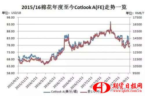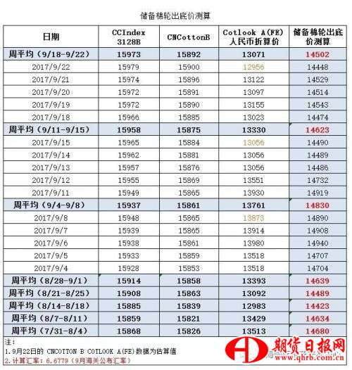 外盤市場方面,自8月下旬以來ICE期棉基本隨颶風(fēng)而動。在哈維、艾爾瑪掃過后,瑪麗亞又成為影響近兩周市場的關(guān)鍵因素。本周隨著瑪麗亞對棉花造成的潛在破壞的擔(dān)憂減退,ICE期棉主力合約周四一度大跌1.52%,周五亞洲電子盤在探底68.11美分/磅后暫時趨穩(wěn),但已回歸至哈維來臨前的位置。ICE期棉的頹勢對CotlookA指數(shù)的影響立竿見影,本周CotlookA均價79.36美分/磅,折人民幣13071元/噸,較上周下跌259元,外盤再次成為“牽動”拋儲底價變化的關(guān)鍵因素。