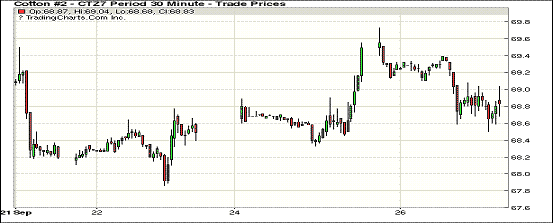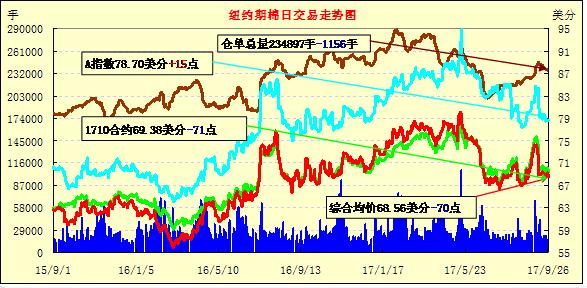 周二美元指數(shù)上漲,紐約期棉再次下跌,成交量減少;1712合約收于68.75美分/磅,跌71點(diǎn);1803合約收于67.89美分/磅,跌65點(diǎn)。當(dāng)日12月合約周二開盤后上漲,并且很快觸及當(dāng)日最高價(jià)69.73美分/磅。合約離開最高價(jià)后下跌走低,在當(dāng)日之后的交易中保持在跌幅區(qū)間。近期對(duì)德克薩斯棉區(qū)不良天氣的擔(dān)憂引起關(guān)注,目前處于采收階段的棉區(qū)降溫降雨,給作物帶來(lái)不利影響。