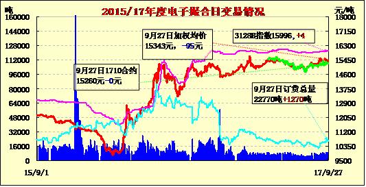 9月27日電子撮合交易成交量增加,成交積極合約主要集中于中遠期合同,MA1801成交量最大,為2470噸;訂貨量增加,其中MA1801增加最多,為650噸;合同均價多數下跌。現貨市場穩(wěn)定,南疆籽棉收購價格略高,棉農多數惜售,多數在7.2-7.6元/公斤之間,部分軋花廠已零星加工,部分絮棉銷售報價在16800元/噸左右,個別較高叫至17000元/噸?,F貨成交零星,一商家內地庫16/17年度手摘疆棉3128級強力26-27倉單棉銷售報價在16400-16500元/噸。
