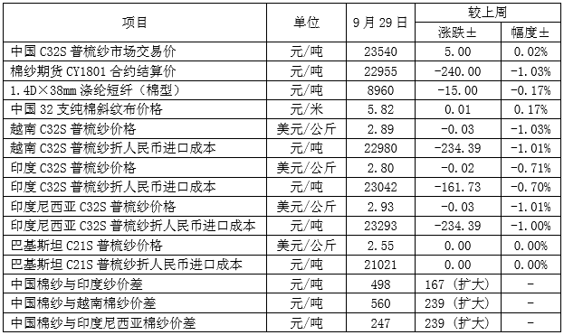 本周,美國得州持續(xù)低溫陰雨天氣,促使國際棉價小幅反彈。印度和巴基斯坦新棉上市量逐漸增加,棉價隨之下跌。9月29日,紐約棉花期貨12月合約結(jié)算價68.45美分/磅,較上周下跌0.01美分/磅,跌幅0.01%,代表進口棉中國主港到岸均價的國際棉花指數(shù)(M)為79.46美分/磅,折人民幣進口成本13515元/噸(1%關(guān)稅,海關(guān)計征匯率,下同),較上周上漲53元/噸,漲幅0.39%,低于國內(nèi)市場2373元/噸,內(nèi)外棉價差較上周縮小65元/噸。印度國內(nèi)S-6棉花價格75.71美分/磅,折人民幣進口成本12846元/噸,較上周下跌534元/噸,跌幅4.06%,低于國內(nèi)棉花價格3042元/噸,價差較上周擴大531元/噸;巴基斯坦國內(nèi)標準級棉花價格70.35美分/磅,折人民幣進口成本12011元/噸,較上周下跌56元/噸,跌幅0.47%,低于國內(nèi)市場3877元/噸,價差較上周擴大44元/噸。