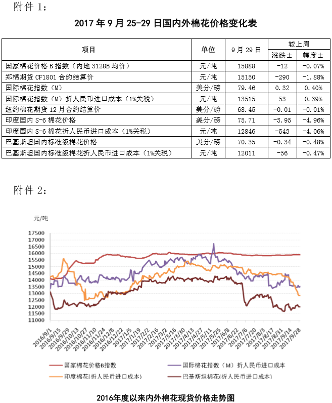 附件1:2017年9月25-29日國內(nèi)外棉花價格變化表