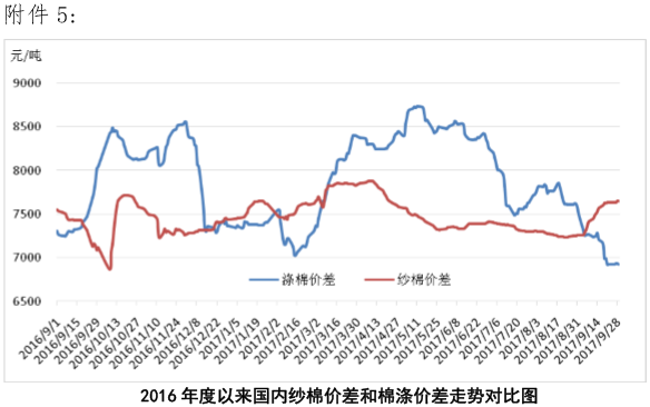 國內(nèi)棉價下跌空間有限。8月份,工業(yè)生產(chǎn)者出廠價格指數(shù)(PPI)環(huán)比上升0.8個百分點;而工業(yè)生產(chǎn)者購進價格指數(shù)(PPIRM)環(huán)比上升0.7個百分點,PPI與PPIRM差較7月份縮小0.1個百分點。企業(yè)成本降低,價格上升,使工業(yè)利潤增速加快,1-8月份,全國規(guī)模以上工業(yè)企業(yè)實現(xiàn)利潤總額同比增長21.6%,增速較去年同期加快13.2個百分點。其中,紡織整體盈利形勢欠佳,1-8月紡織業(yè)利潤總額增長4.1%,增速較去年同期放緩1.7個百分點?;久嫔?,本周全國新棉采摘交售進度加快,籽棉收購價格下調(diào)。截至9月29日,全國新棉采摘進度為16.6%,累計交售籽棉折皮棉36.9萬噸。新疆機采棉收購價格回落至6.1-6.2元/公斤,手采棉下降至7.1-7.2元/公斤,南疆手采棉下降至6.95元/公斤;內(nèi)地籽棉收購報價基本平穩(wěn)在3.5-3.6元/斤左右。10月份以后,新疆棉區(qū)氣溫開始下降,對于棉花的吐絮采摘不利,新棉采摘收購進度將進一步加快,目前新疆軋花產(chǎn)能過剩,籽棉資源有限,短期內(nèi)將限制棉花收購銷售價格下跌空間,后期隨著新花加工銷售量的增加,棉價將逐漸回歸理性。近期下游紡企生產(chǎn)經(jīng)營形勢逐漸回升,旺季特征顯現(xiàn),但生產(chǎn)效益并無太大提高,另外,近日工信部印發(fā)《印染行業(yè)規(guī)范條件(2017版)》,并于10月1日起開始實施,紡織印染行業(yè)集體面臨新一輪環(huán)保壓力。