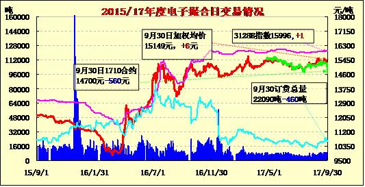 9月30日電子撮合交易成交量減少,成交積極合約主要集中于中遠期合同,MA1712和MA1802成交量最大,為760噸;訂貨量減少,其中MA1711減少最多,為440噸;合同均價多數(shù)收漲。截止到2017年9月29日24點,新疆地區(qū)皮棉加工總量18.94萬噸,其中,兵團加工量8.24萬噸,地方加工量10.70萬噸,日增量3.09萬噸,同比增加26%。據(jù)了解,當前紡企采購意愿不強,部分只詢價觀望,無采購,少量紡企采購新棉,但成交量多以一到二批成交。
