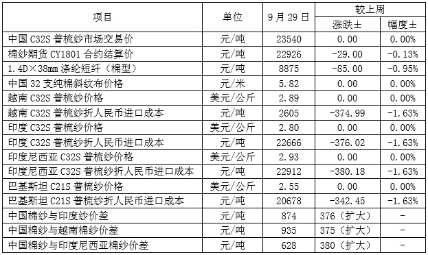 本周,國內(nèi)棉價(jià)小幅下跌,國際棉花價(jià)格小幅上漲;國內(nèi)外棉紗價(jià)格保持平穩(wěn);滌綸短纖價(jià)格延續(xù)弱勢。