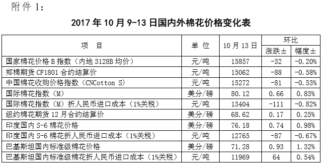附件1:2017年10月9-13日國內(nèi)外棉花價(jià)格變化表
