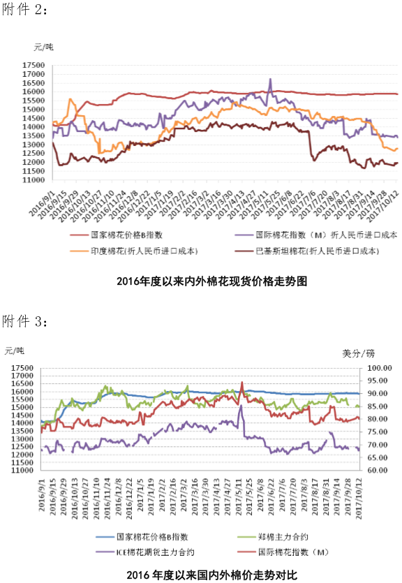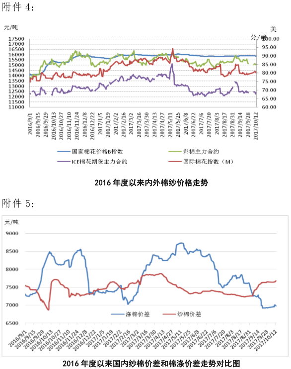 國內(nèi)棉價(jià)趨于穩(wěn)定。國際貨幣基金組織(IMF)將中國今明兩年增速預(yù)測0.1個(gè)百分點(diǎn)至6.8%和6.5%,國家統(tǒng)計(jì)局預(yù)計(jì)今年可實(shí)現(xiàn)經(jīng)濟(jì)6.5%增長目標(biāo)。人民幣升值因素使得2017年我國進(jìn)口增速大幅超過出口,9月出口回升明顯要弱于預(yù)期,8月紡織服裝出口同比增速開始出現(xiàn)負(fù)增長。9月30日央行公布“定向降準(zhǔn)”政策、及10月13日超額續(xù)作中期借貸便利(MLF),均反映出央行對于貨幣政策的結(jié)構(gòu)性優(yōu)先,流動性整體不放松,近期人民幣匯率逐漸企穩(wěn)雙向波動,出口壓力可能有所減輕?;久嫔希瑑涿掭喅鼋Y(jié)束后,紡企原料庫存充足,新棉開秤價(jià)較高,準(zhǔn)備采購原料的企業(yè)減少,新棉采摘交售進(jìn)度較去年也有所放緩,據(jù)國家棉花市場監(jiān)測系統(tǒng)調(diào)查數(shù)據(jù)顯示,截至2017年10月13日全國新棉采摘進(jìn)度為44.5%,同比下降3.9個(gè)百分點(diǎn),新棉加工率和銷售率較去年同期均有不同程度下降。近期棉籽價(jià)格止跌企穩(wěn),新棉購銷價(jià)格趨于穩(wěn)定,下游棉紗旺季特征顯現(xiàn),高支紗利潤增長,布產(chǎn)銷形勢開始回升,高質(zhì)量棉花需求將逐漸增加,預(yù)計(jì)10月中下旬,籽棉購銷工作將全面展開,國內(nèi)棉花價(jià)格或?qū)⒕S持平穩(wěn)走勢。