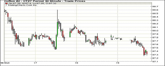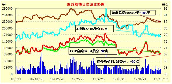 上周美棉簽約量增加,但未能使期價止跌,周四紐約期棉繼續(xù)下行;1712合約收于67.31美分/磅,跌32點;1803合約收于67.01美分/磅,跌32點。當日主力合約周四開盤后上周并交投活躍,但短暫的上漲后下跌,收盤前未能完成反彈,收于當日交投區(qū)間底部。上周美棉新花簽約5.7萬噸,裝運2.0萬噸,簽約和裝運分別達到預測出口量的12%和58%,簽約進度快于往年同期。