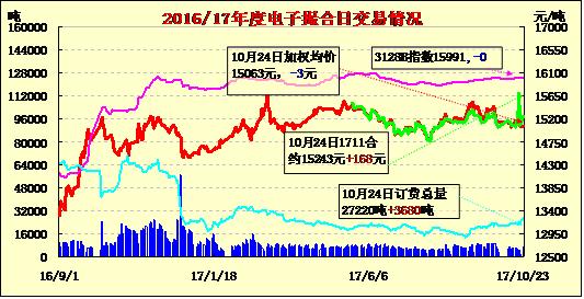 23日電子撮合交易成交量增加,整體合同均價多數(shù)收漲,其中近月MA1711合同漲幅加大,均價上漲168元/噸,但成交量較小為70噸;活躍交投的合同還是多集中于遠(yuǎn)期,18年01、02、03合同訂貨量都較大,其中MA1803訂貨量最大,為1860噸。國內(nèi)市場方面,新疆棉加工量截至10月22日為127.64噸,其中,兵團(tuán)加工量47.31萬噸,地方加工量80.35萬噸,日增量5.53萬噸。近期新疆棉皮棉銷售報價多數(shù)在15600-16300元/噸,銷售情況一般。國際市場方面,印度古吉拉特邦政府宣布將提高古邦籽棉新花最低收購價格(MSP),在原MSP的基礎(chǔ)上每公擔(dān)(1公擔(dān)=100公斤)提高500盧比。