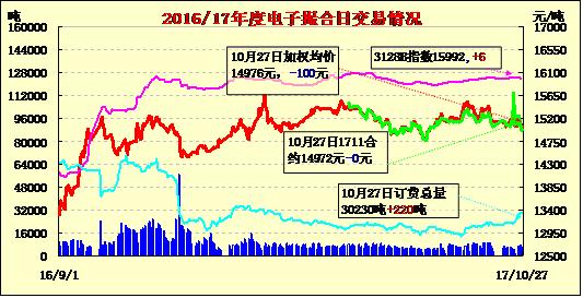27日電子撮合交易成交量減少,整體合同均價(jià)多數(shù)收跌,其中近月MA1802合同跌幅最大,均價(jià)下跌124元/噸,成交量較大,為2060噸;活躍交投的合同多集中于遠(yuǎn)期合同,整體訂貨量總量有所增加,其中MA1804訂貨量最大,為390噸。近期新疆棉皮棉銷售報(bào)價(jià)多數(shù)在15600-16300元/噸,雙29棉花新疆現(xiàn)貨報(bào)價(jià)16200元/噸,銷售情況一般。近期長(zhǎng)江流域企業(yè)反饋,目前儲(chǔ)備棉庫(kù)存仍可維護(hù)兩個(gè)月用量,由于配棉的需求,企業(yè)少量采購(gòu)新棉,采購(gòu)的新棉主要來(lái)自河北、山東、湖北等地,質(zhì)量參差不齊,4128B價(jià)在15200-15500元/噸,用棉成本高于儲(chǔ)備棉庫(kù)存500-700元/噸。鄭棉期貨CF1701主力合約小幅度收跌,收于14950元/噸。