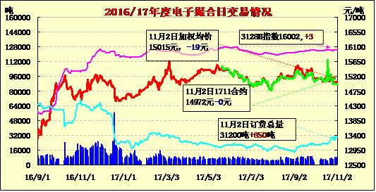 2日電子撮合交易成交量增加,整體合同均價漲跌互現(xiàn),其中近月MA804合同下跌較大,均價下跌95元/噸,成交量較小,為840噸;活躍交投的合同多集中于遠期合同,整體訂貨量總量有所增加,其中MA1803訂貨量最大,累計訂貨量為7710噸。聊城、德州等地地產(chǎn)棉現(xiàn)貨陸續(xù)上市,但呈現(xiàn)有價無市狀態(tài)。比如,當日,聊城某企業(yè)3128級、4128級皮棉現(xiàn)貨價格分別為16100元/噸、15600元/噸,較昨日持平。但據(jù)各軋花廠介紹,近期詢價、看貨的企業(yè)特別少,實單成交更少。新疆阿克蘇地區(qū)棉籽運抵山東榨油廠價格在1.13-1.16元/斤。鄭棉期貨主力合約上漲,收于15050元/噸。