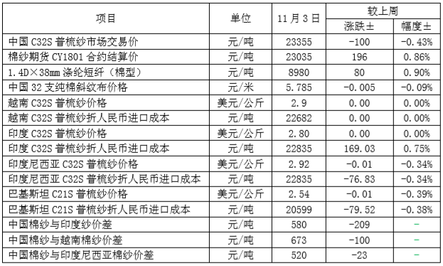 本周,國(guó)內(nèi)新棉購(gòu)銷有所恢復(fù),推動(dòng)國(guó)內(nèi)棉價(jià)小幅上漲。11月3日代表內(nèi)地標(biāo)準(zhǔn)級(jí)皮棉銷售均價(jià)的國(guó)家棉花價(jià)格B指數(shù)15875元/噸,較上周上漲5元/噸,漲幅0.03%。鄭州棉花期貨CF1801合約結(jié)算價(jià)15158元/噸,較上周上漲226元/噸,漲幅1.51%。代表全國(guó)主產(chǎn)棉省(區(qū))白棉3級(jí)籽棉折皮棉均價(jià)的中國(guó)棉花收購(gòu)價(jià)格S指數(shù)15280元/噸,較上周上漲17元/噸,漲幅0.11%。