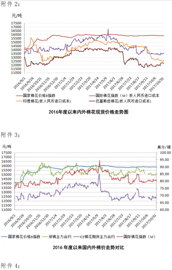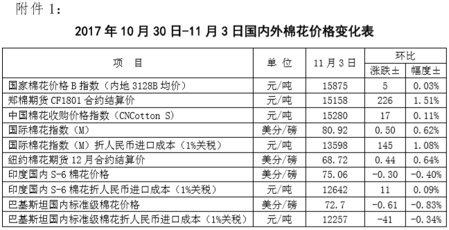 附件1:2017年10月30日-11月3日國(guó)內(nèi)外棉花價(jià)格變化表