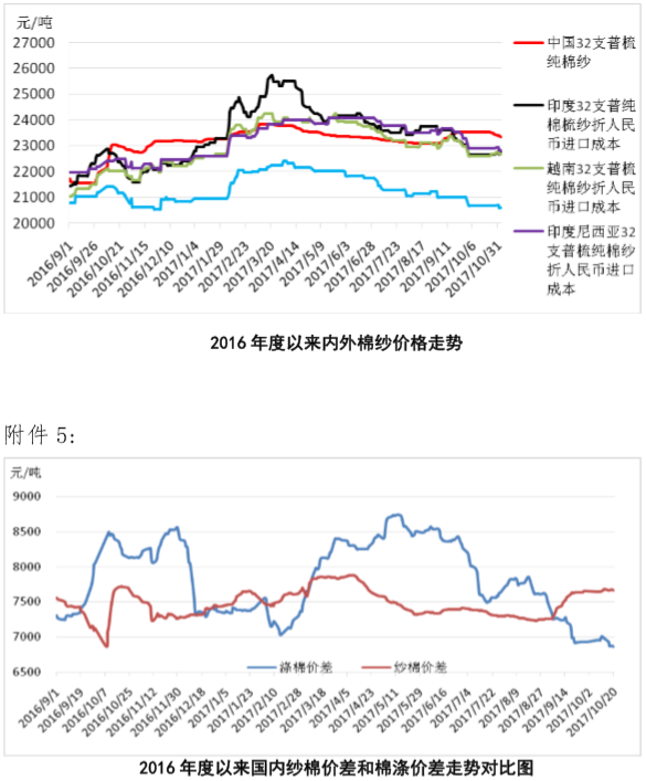 附件4:2016年度以來(lái)國(guó)內(nèi)外棉紗價(jià)格走勢(shì)圖