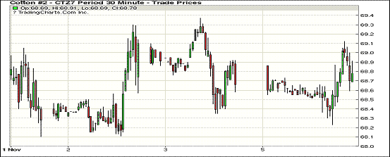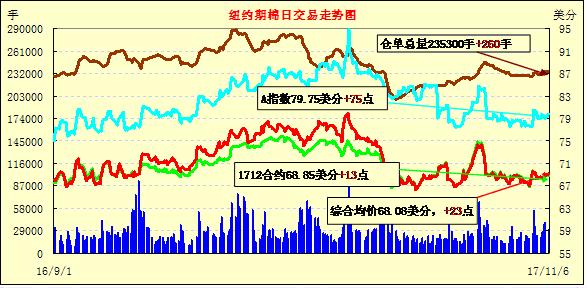 周一紐約期棉受其他商品帶動微幅上漲;1712合約收于68.85美分/磅,漲13點(diǎn),1803合約收于69.10美分/磅,漲33點(diǎn)。當(dāng)日1712合約高開后走低,全天多數(shù)時間在跌幅區(qū)間內(nèi)交投,之后期棉在其他商品帶動下上漲,最終收于當(dāng)日89點(diǎn)區(qū)間中部。至本周美棉新花采摘54%,德克薩斯新花采摘進(jìn)度44%,較前一周增加7個百分點(diǎn)。全美新花吐絮進(jìn)度96%,近五年和去年同期均為98%。