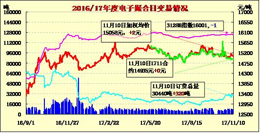 10日電子撮合交易成交量減少,整體合同均價(jià)多數(shù)收漲,基本所有合同上漲幅度都較小,其中MA804成交量較大,為2020噸;活躍交投的合同多集中于遠(yuǎn)期合同,整體訂貨量總量有所增加,其中MA1801訂貨量最大,累計(jì)訂貨量為8100噸。截止到2017年11月9日24點(diǎn),新疆地區(qū)皮棉加工總量232.46萬(wàn)噸,其中,兵團(tuán)加工量80.16萬(wàn)噸,地方加工量152.30萬(wàn)噸,日增量6.05萬(wàn)噸。枝江、荊州、潛江等地大廠多收購(gòu)22級(jí)以上籽棉,便于皮棉銷售,收購(gòu)量較少,皮棉1227級(jí)報(bào)價(jià)在15000元/噸左右。武漢新洲、東西湖等地小廠較為靈活,高低等級(jí)籽棉均有收購(gòu),皮棉分級(jí)定價(jià),2227級(jí)報(bào)價(jià)多在14100-14200元/噸(凈重帶票)。鄭棉期貨主力合約收紅,收于15190元/噸。