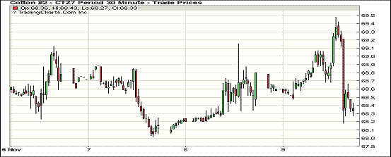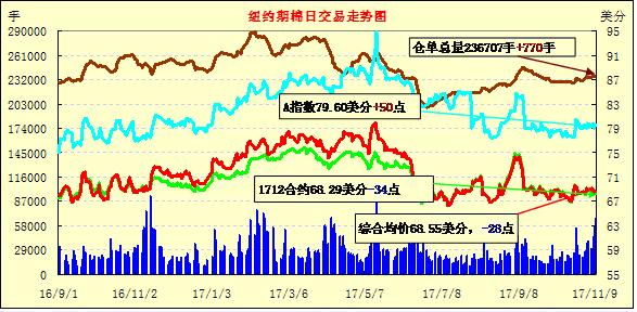 周四紐約期棉在USDA月報(bào)發(fā)布后下跌并最終小幅收跌,1712合約收于68.72美分/磅,跌36點(diǎn);1803合約收于68.77美分/磅,跌20點(diǎn)。當(dāng)日紐約期棉小幅高開低走,USDA月報(bào)發(fā)布前曾短暫上漲,預(yù)測(cè)發(fā)布后主力合約下跌到當(dāng)日交投區(qū)間底部。本月USDA預(yù)測(cè)上調(diào)中美兩國(guó)新花產(chǎn)量,分別調(diào)增11萬噸和6萬噸,全球產(chǎn)量調(diào)增13萬噸,但中國(guó)和孟加拉消費(fèi)也有調(diào)增,全球消費(fèi)調(diào)增27萬噸,期末庫存調(diào)減33萬噸。