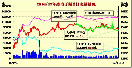 14日電子撮合交易成交量減少,整體合同均價多數(shù)收跌,基本所有合同上漲幅度都較小,其中MA804成交量較大,為2250噸;活躍交投的合同多集中于遠(yuǎn)期合同,整體訂貨量總量有所增加,其中MA1801訂貨量最大,累計訂貨量為8080噸。截止到2017年11月13日24點,新疆地區(qū)皮棉加工總量257.45萬噸,其中,兵團(tuán)加工量88.23萬噸,地方加工量169.22萬噸,日增量6.37萬噸。截止13日,安徽當(dāng)?shù)刈衙奘召弮r格在3.30-3.39元/斤之間,棉販下鄉(xiāng)收購價格在3.20元/斤。皮棉銷售價格在15200-15600元/噸,4級弱的價格在14500元/噸,銷售依然不暢。主要原因:一是紡織廠國儲棉較充足。近日,新疆棉的報價又降低在16100-16300元/噸(毛重提貨價),因此,導(dǎo)致內(nèi)地棉的銷售很困難;二是期貨價格難起,紡織廠觀望心理不減。