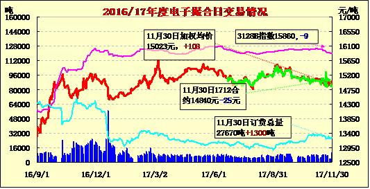 30日電子撮合交易交易成交量增加,整體合同均價(jià)多數(shù)收漲,合同上漲幅度較小,其中MA802成交量較大,為2930噸;活躍交投的合同多集中于遠(yuǎn)期合同,整體訂貨量總量有所增加,其中MA1803訂貨量最大,累計(jì)訂貨量為8060噸。國(guó)內(nèi)市場(chǎng)方面: 截止到2017年11月29日24點(diǎn),新疆地區(qū)皮棉加工總量350.32萬(wàn)噸,其中,兵團(tuán)加工量118.71萬(wàn)噸,地方加工量231.6萬(wàn)噸,日增量5.69萬(wàn)噸。29日,山東某廠負(fù)責(zé)人介紹,眼下他們廠原料庫(kù)存降至15天,較上個(gè)月的近30天下降50%。主要原因:一是流動(dòng)資金不足;二是對(duì)眼下棉花行情吃不準(zhǔn),不敢大量采購(gòu)。由于紡企的消極態(tài)度,近期內(nèi)地棉花行情繼續(xù)下跌。29日,冀魯豫地區(qū)3128級(jí)地產(chǎn)棉價(jià)格在14700元/噸,較本月中旬跌500-600元/噸。