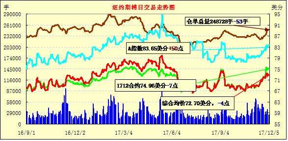 周二紐約期棉小幅收跌,1712合約收于74.96美分/磅,跌7點(diǎn),1803合約收于72.51美分/磅,跌7點(diǎn)。當(dāng)日主力合約開盤后下跌并在跌幅區(qū)間內(nèi)保持,盤中買入增加,合約價(jià)最高漲至73.15美分/磅,收盤前再次下跌,合約最終收于當(dāng)日走勢(shì)區(qū)間中部。本周少量美棉簽約取消,巴基斯坦因印度棉進(jìn)口限制取消,對(duì)美棉購(gòu)買力也有所下降。