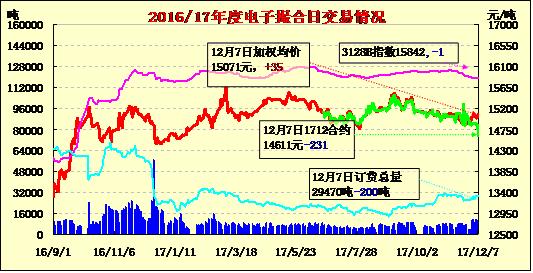 7日電子撮合交易成交量減少,整體合同均價(jià)多數(shù)收跌,合同下跌幅度較小,其中MA805成交量較大,為3660噸;活躍交投的合同多集中于遠(yuǎn)期合同,整體訂貨量總量有所減少,其中MA1803訂貨量最大,累計(jì)訂貨量8740噸。截止到2017年12月6日24點(diǎn),新疆地區(qū)皮棉加工總量386.34萬噸,其中兵團(tuán)加工量129.61萬噸,地方加工量256.73萬噸,日增量4.93萬噸。雖11月新疆棉出疆44.81萬噸,但年關(guān)將近,紡企補(bǔ)庫積極性并不高,在部分企業(yè)國(guó)儲(chǔ)棉依然充足情況下,紡企小批量采購為主。