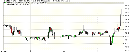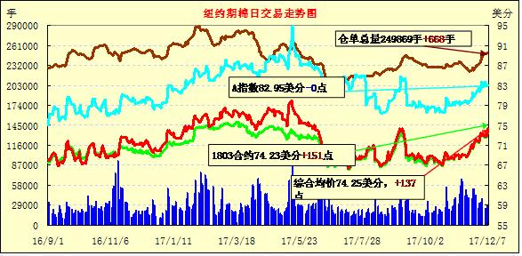 周四紐約期棉再次大漲,1803合約收于74.23美分/磅,漲151點;1805合約收于74.64美分/磅,漲125點。當日主力合約在美棉出口數(shù)據(jù)發(fā)布后走低,但很快在大量買盤的支撐下回升并進入漲幅區(qū)間,收盤前突破近期阻力位,最終漲幅超2%。至11月30日一周,本年度美棉簽約18.86萬包,下年度簽約5.04萬包,美棉簽約進度達到預期出口的74%;當周中國取消大量本年度陸地棉簽約。