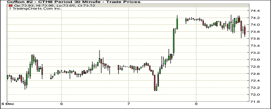 8日紐約期棉市場(chǎng)小幅下跌,主力3月合約結(jié)算價(jià)73.72美分/磅,跌51點(diǎn);1805合約74.20美分,跌44點(diǎn)。主要關(guān)注近日將發(fā)布的USDA供需平衡表。當(dāng)日3月合約整日交易平淡,小幅高開(kāi)后圍繞74美分上下窄幅波動(dòng),整日高低區(qū)間73.62-74.28(66點(diǎn)),尾盤(pán)位于日低水平,終以小幅收跌。USDA12月全球供需平衡表發(fā)布在即,密切關(guān)注調(diào)整動(dòng)向,目前最為關(guān)注的是USDA對(duì)美國(guó)及其他主產(chǎn)地區(qū)產(chǎn)量調(diào)整。
