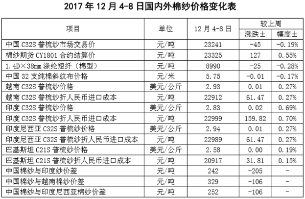 本周國(guó)內(nèi)除南疆籽棉收購(gòu)工作仍在持續(xù)以外,大部分地區(qū)籽棉收購(gòu)接近尾聲,皮棉供應(yīng)壓力增加,國(guó)內(nèi)棉花現(xiàn)貨價(jià)格繼續(xù)下跌,鄭棉期貨價(jià)格隨ICE期棉繼續(xù)上漲。12月4-8日代表內(nèi)地標(biāo)準(zhǔn)級(jí)皮棉銷售均價(jià)的國(guó)家棉花價(jià)格B指數(shù)15746元/噸,較上周下跌21元/噸,跌幅0.13%。鄭州棉花期貨CF1801合約結(jié)算價(jià)15410元/噸,較上周上漲216元/噸,漲幅1.42%。代表全國(guó)主產(chǎn)棉省(區(qū))白棉3級(jí)籽棉折皮棉均價(jià)的中國(guó)棉花收購(gòu)價(jià)格S指數(shù)14701元/噸,較上周下跌144元/噸,跌幅0.97%。