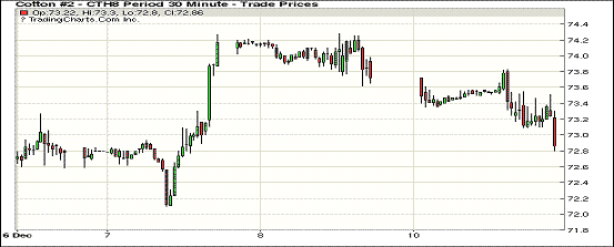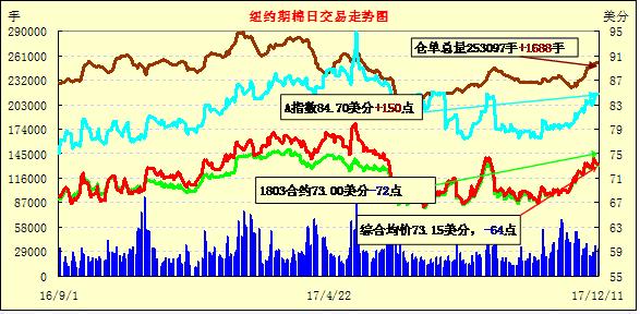 8日紐約期棉市場小幅下跌,主力3月合約結(jié)算價73.72美分/磅,跌51點;1805合約74.20美分,跌44點。市場主要關注近日將發(fā)布的USDA供需平衡表。當日3月合約整日交易平淡,小幅高開后圍繞74美分上下窄幅波動,整日高低區(qū)間73.62-74.28(66點),尾盤位于日低水平,終以小幅收跌。USDA12月份全球供需平衡表發(fā)布在即,市場密切關注調(diào)整動向,目前最為關注的是USDA對美國及其他主產(chǎn)地區(qū)產(chǎn)量的調(diào)整。