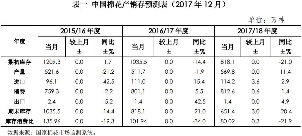 本期國內(nèi)棉花產(chǎn)銷存預(yù)測僅對2017/18年度棉花進口量及消費量數(shù)據(jù)略做調(diào)整。調(diào)整后,2017/18年度國內(nèi)棉花期末庫存651.4萬噸,同比下降20.4%,期末庫存消費比為80.02,同比下降21.9個百分點。