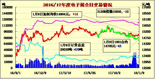 9日電子撮合交易成交量減少,整體合同均價多數收漲,整體合同上漲幅度較小,其中MA805成交量較大,為2180噸;活躍交投的合同多集中于遠期合同,整體訂貨量總量有所減少,其中MA1805訂貨量最大,累計訂貨量為7480噸。截止到2108年1月8日24時,新疆地區(qū)皮棉加工總量476.98萬噸,同比增加22%。其中兵團加工量148.43萬噸,地方加工量328.55萬噸。 據了解,近幾日北疆地區(qū)機采棉報價堅挺,并沒有過多的漲跌,但是報價較混亂,強力28長度29的機采棉銷售價在15400-15600元/噸(毛重)之間不等。北疆部分棉企銷售也呈兩極化,有的棉企由于價格過低恐虧損太多一批都未銷售,有的則銷售近80%。